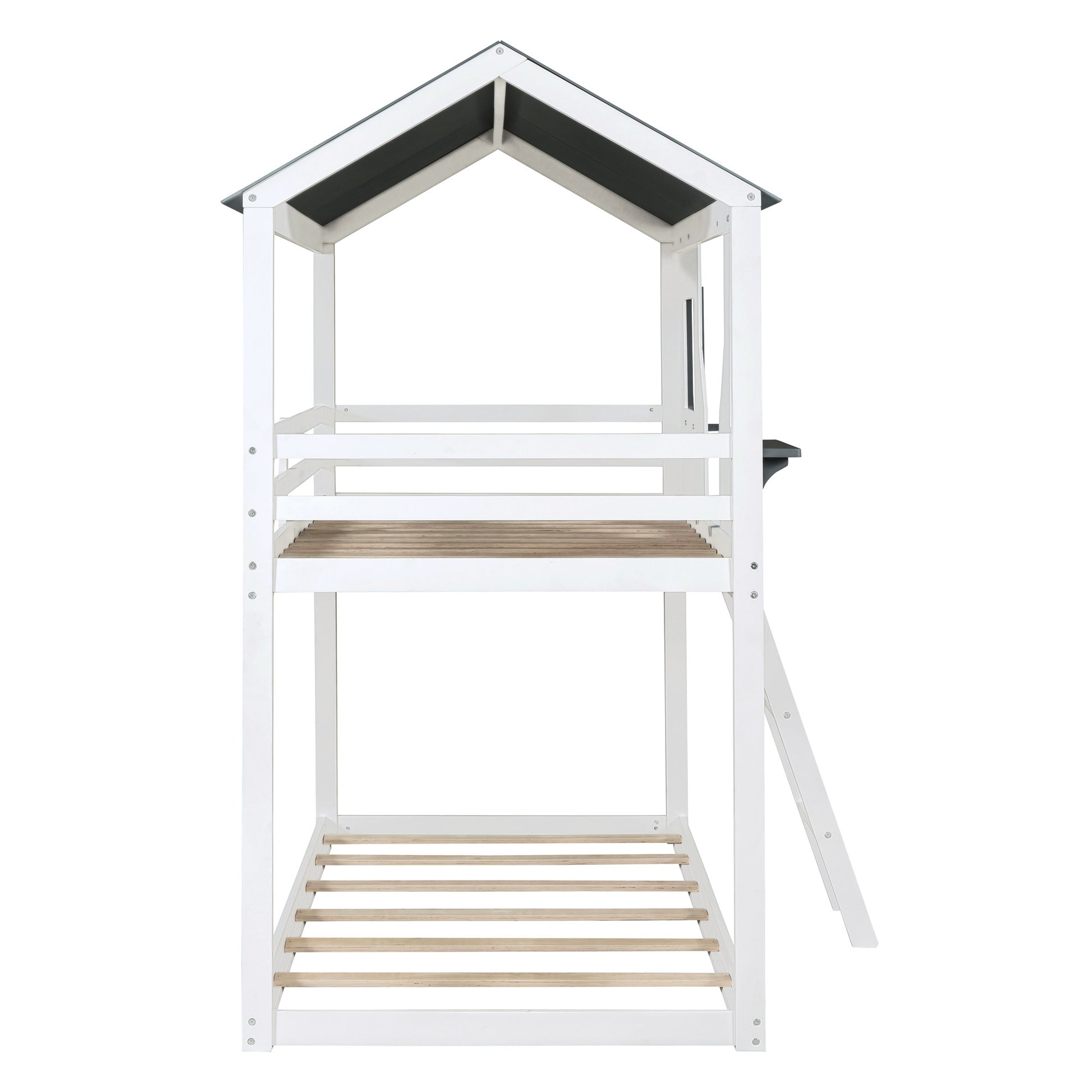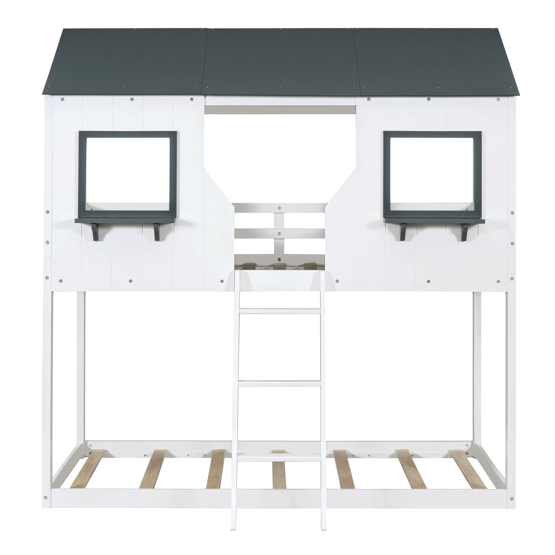 Twin Over Twin Bunk Bed Wood Bed with Roof, Window, Guardrail, Ladder , White