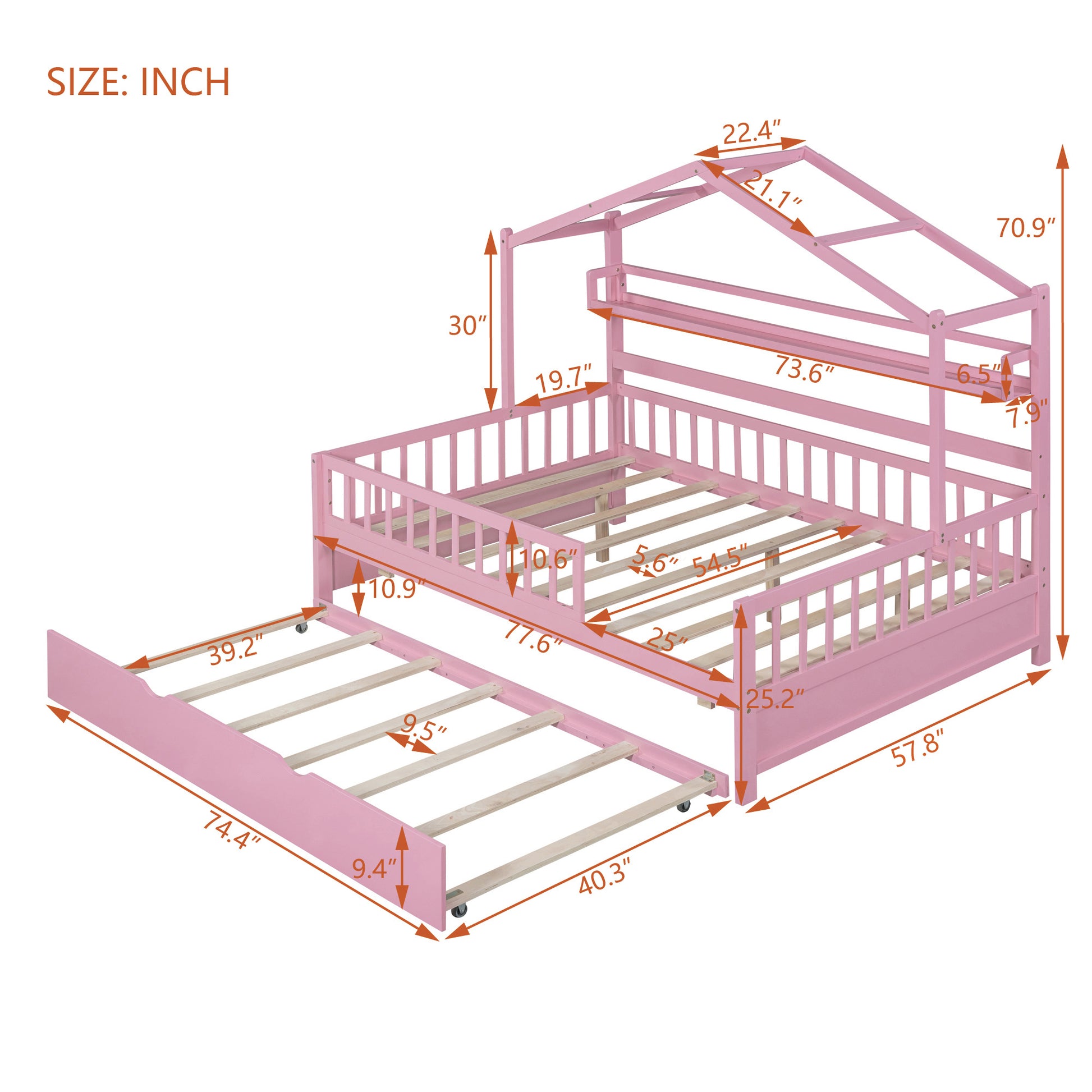 Wooden Full Size House Bed with Twin Size Trundle,Kids Bed with Shelf, Pink
